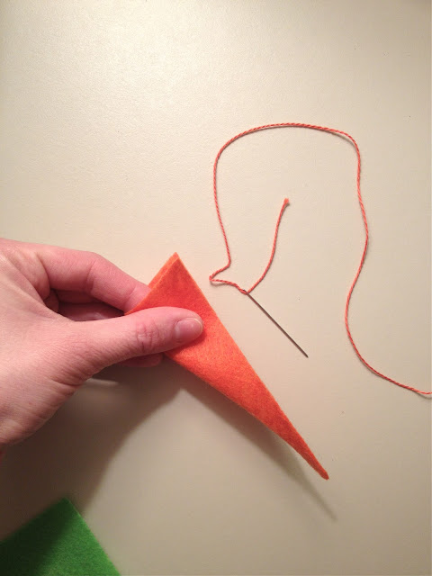 Take the carrot triangles and fold in half the long way. Do a basic stitch starting at the widest end and working your way towards the tip- leaving about an 1/2 an inch open at the bottom.